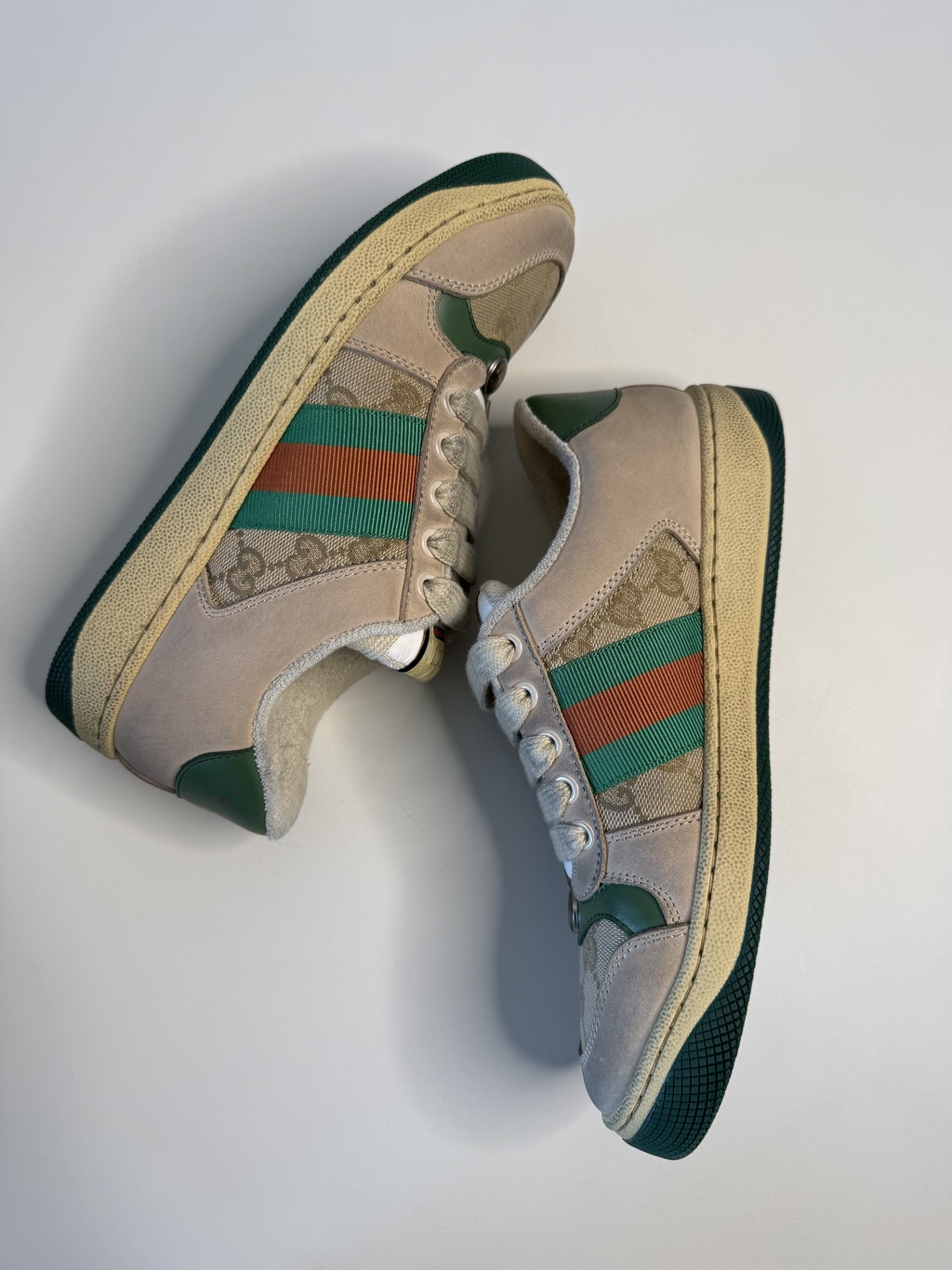Tênis Gucci Screener com vibe 70s, visual envelhecido e assinatura GG.